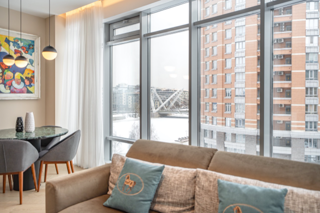 Рядом мост Бетанкура — дорога до аэропорта или загород занимает не более 30 минут, а до Дворцовой площади можно доехать за 10 минут. При этом вы живете в тихом зеленом месте у воды.